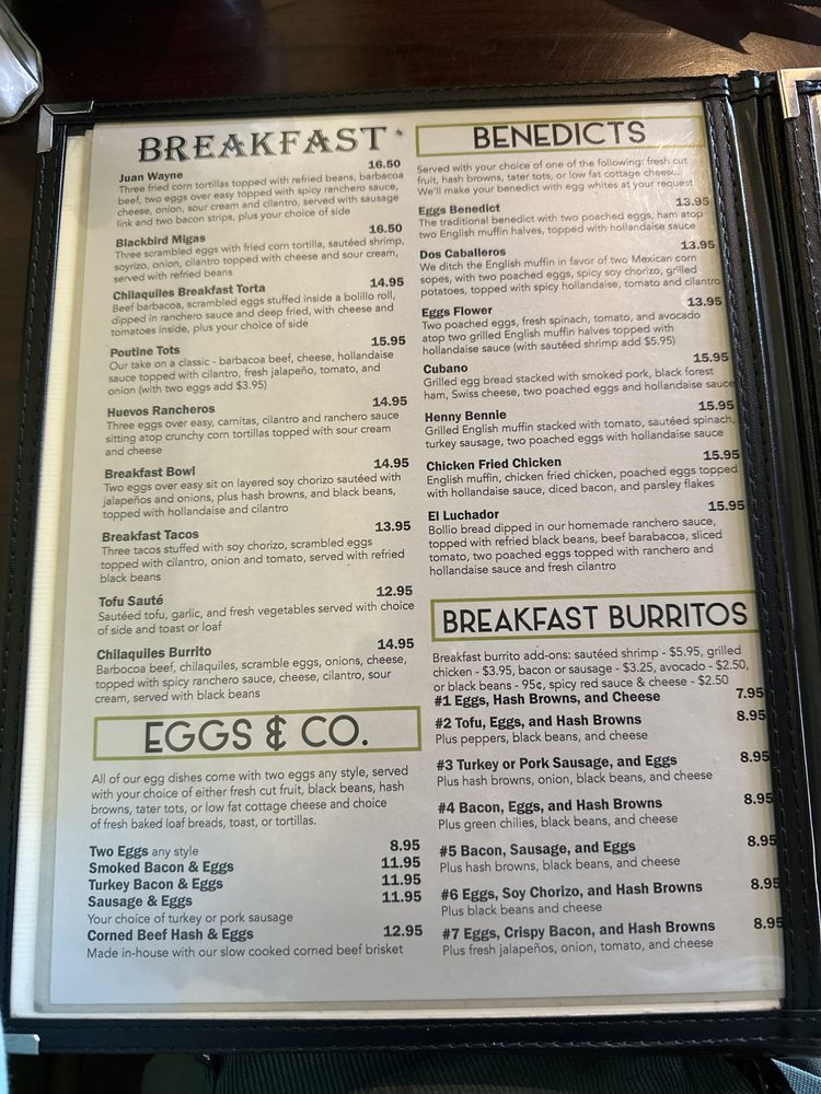 Bolilio bread dipped in ranchero sauce, topped with refried black beans,beef barbacoa,tomato two poached eggs topped w/ ranchero sauce, hollandaise sauce and cilantro